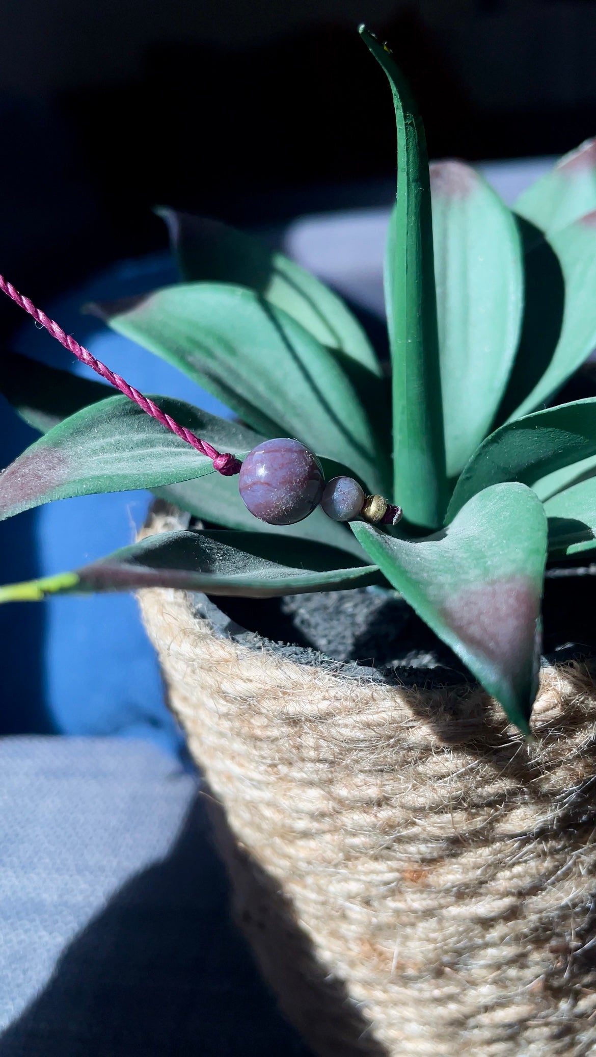 - Handmade with fancry jasper gemstone, polyester cords, and brass beads.